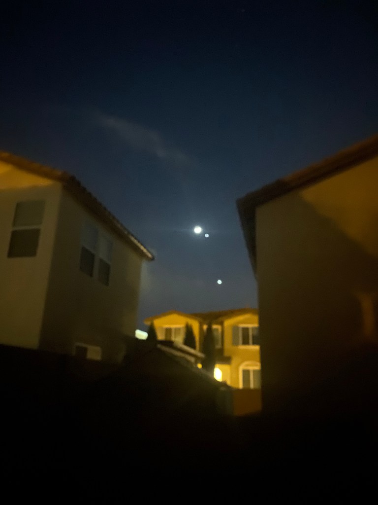 Last night, I saw the crescent moon align with Jupiter and Venus. The photo I took does not portray the beauty I witnessed.