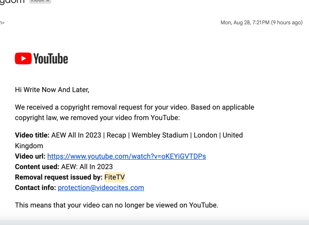 AEW was fine with me posting the video. FiteTV however told YouTube to remove it.